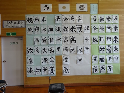 中条中学校の生徒たちも、国語の書きぞめの授業の一環として、今年一年を表す漢字を考え、筆で半紙に書き上げました。