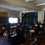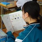 中条中学校の生徒たちも、国語の書きぞめの授業の一環として、今年一年を表す漢字を考え、筆で半紙に書き上げました。