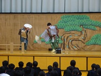 今回は、一般社団法人京都能楽囃子方同明会の方々をお迎えし、能囃子「獅子」の鑑賞や、小学校の国語の教科書にも掲載されている有名な狂言「附子」の鑑賞を行いました。