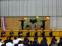 また、事前ワークショップで体験し、音楽の授業でも練習に取り組んだ「三番三(さんばそう)」という演目を3年生が披露しました。