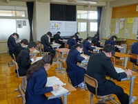 3年生後期期末テスト 2026年2月5日 最終更新日時 : 2026年2月6日 kumagaya_edit 本日、3年生が国語・社会・数学・理科・英語の5教科による後期期末テストを実施しました。生徒たちは、公立高校入試を目前に控え、中学校生活最後の定期テストに緊張感をもちながらも、集中して取り組んでいました。